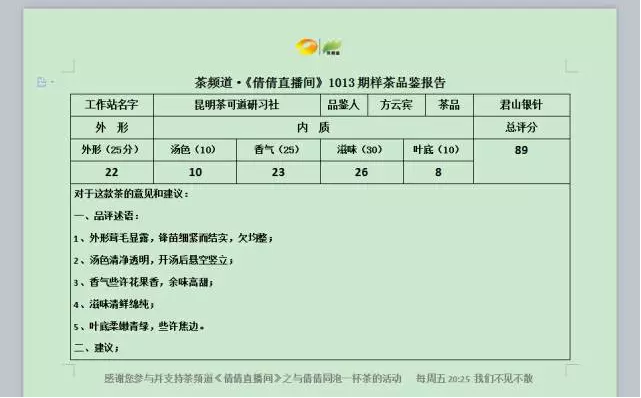 當(dāng)然了,與倩倩同泡一款茶的6家五湖四海的工作站,也依據(jù)自己的品感和喜好,為這款茶打出了相應(yīng)的分?jǐn)?shù),還有專業(yè)品檢報(bào)告與大家分享!